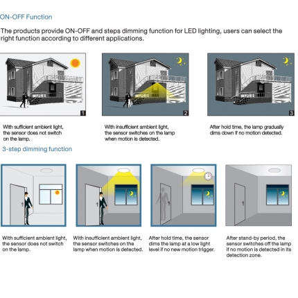 The sensors allow energy saving without compromising comfort. When used in combination with 1-10V dimmable LED drivers or ballasts, they can achieve 3-step dimming function, which is perfect for use in some areas that requires a light change notice before totally switch off.