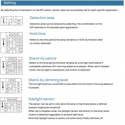 - Detection area, time delay and daylight threshold can be precisely set via DIP switch.
